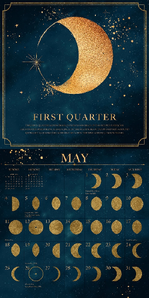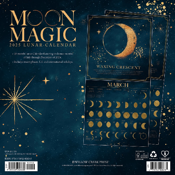 Bask in the luminous glow of the full moon's splendor, or rest and recharge in the darkness of the new moon. From waxing to waning, humans have followed the ebb and flow of the lunar cycle for centuries, embracing our cosmic state of impermanence and reassuring us that change is a reliable, inevitable constant. With metallic ink details and stunning moon illustrations on an inky night sky, the 2025 Moon Magic 12" x 12" Wall Calendar reminds us to enjoy the journey and treasure the special things in life.