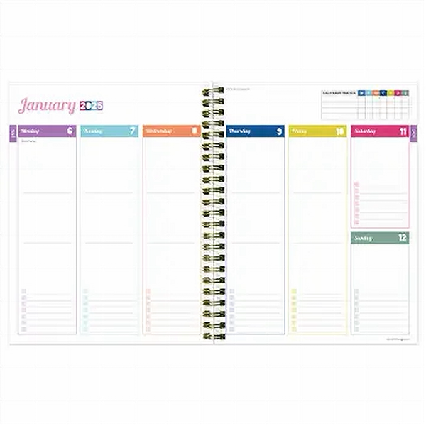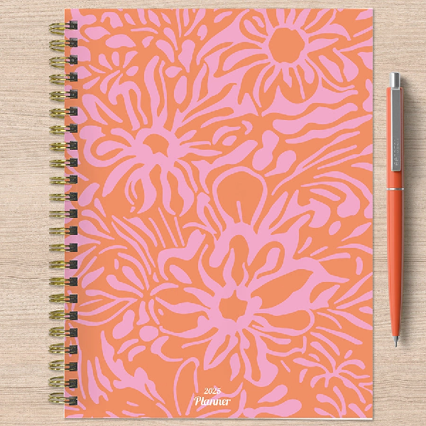 Start every day happy with this medium weekly monthly planner featuring a bright hibiscus cover design! This all-encompassing planner boasts 2-page monthly spreads that include lined sections for notes, tasks, and goals and 2-page weekly spreads with lined daily sections to keep plans neat and organized. Plus, a dedicated weekly priorities section to help you stay focused! The interior pages are designed with a fresh and colorful feel, accented with faux monthly tabs for easy access to weekly planning. This 12-month planner covers January 2025 – December 2025 and includes a plastic free cover and is fully recyclable!