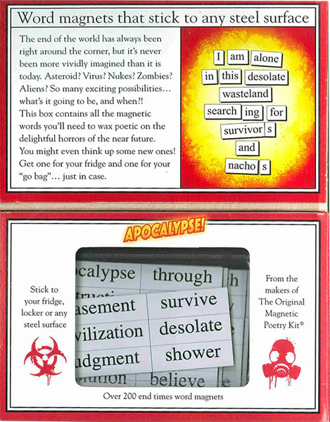 The end is near and this box of word magnets is ready for it! Includes words like explode, bunker, civilization, bummer, meteor, ammo and wasteland.