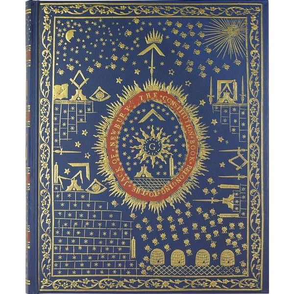 This journal's cover reproduces a gold-tooled pictorial binding, The Constitutions of the Masons, from 18th-century England. The words, ''The Constitution book belonging to the Jack of Newbery,'' appear around the central motif.