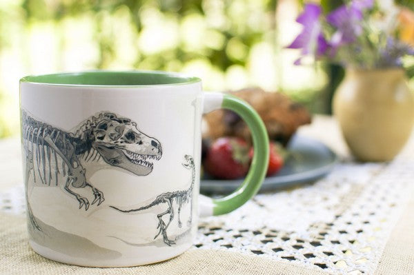 The mug shows a prehistoric landscape populated by fierce dinosaurs. When you pour in a hot beverage, the eons pass before your eyes as the dinosaurs transform into fossils in a museum exhibition. Now, finally, you will know what killed off the dinosaurs. It was YOU!
