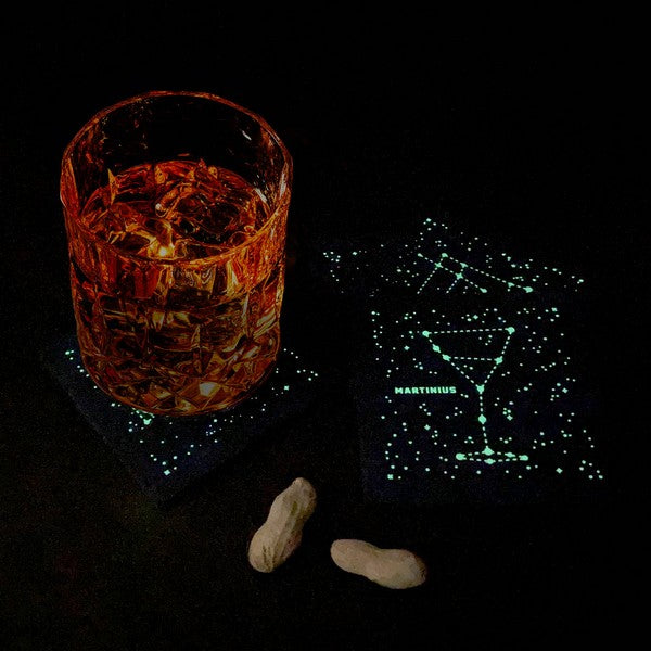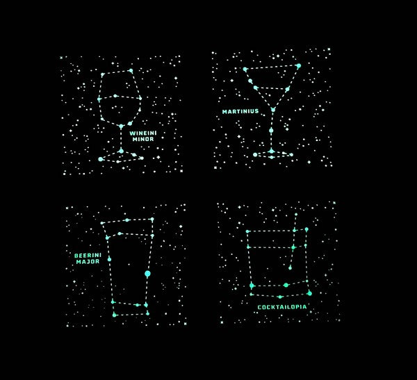 These celestial coasters light up the night with glow-in-the-dark constellations of the best kind: Wineini Minor, Beerini Major, Martinius and Cocktailopia.