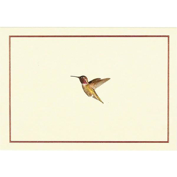 Simple but elegant design features a jewel-hued hummingbird on an ivory background with a ruby border.
