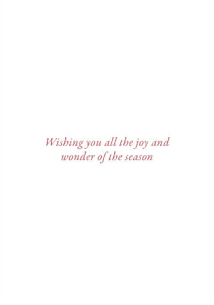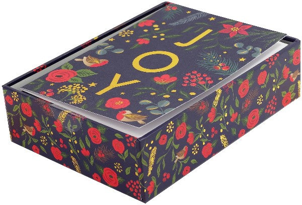 The word ''Joy'' is stamped in gold foil on these beautiful cards, surrounded by birds, holly, poinsettia, evergreens, and other holiday motifs, all set against a deep blue background.