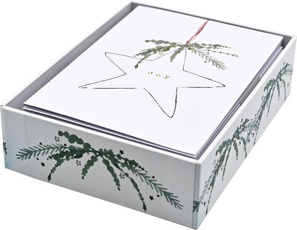 An evergreen-bedecked star surrounds the word ''Joy'' on these elegant greeting cards.