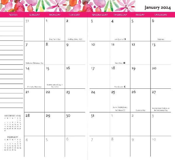 Plan on the go and accomplish those goals with this pretty purse- and pocket-sized scheduling tool! Covers 24 months (2 years, from January 2024 through December 2025). Monthly planner format for those who prefer to view 1 month at a glance. Each spread features 1 month, past and future month calendar references, and ruled notes spaces. Includes a page to note birthdays, anniversaries, and other dates to remember. You'll also find a full list of holidays and observances.