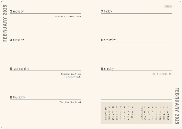 Monthly pages provide helpful overviews of the entire month, with space for notes.