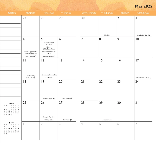 • Each spread features 1 month, past and future month calendar references, and ruled notes spaces.