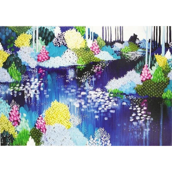 Lovely abstract flowers in pink, yellow, blue, and green are mirrored in dappled, indigo-blue water and shimmer with silver foil highlights.
