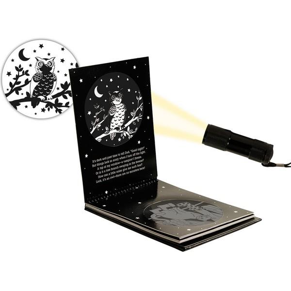 Shine a flashlight (not included) through seven transparent windows to cast shadow images on the wall or ceiling and see the scary things revealed as not-so-scary objects, people, and animals!