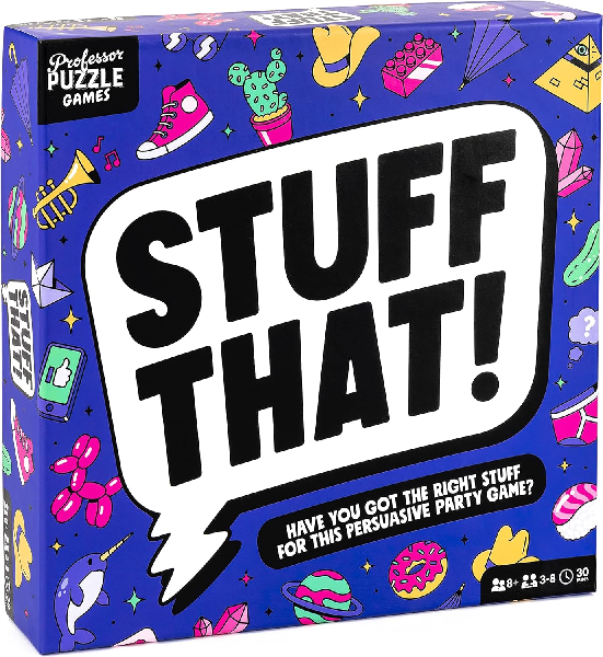 Have you got the right “stuff” for this persuasive party game? Put down as many cards as you can that fit the category, or push your luck and try to sneak in stuff that doesn’t! But watch out! If you play the most stuff, you’ll have to show everyone your cards and argue why they fit!