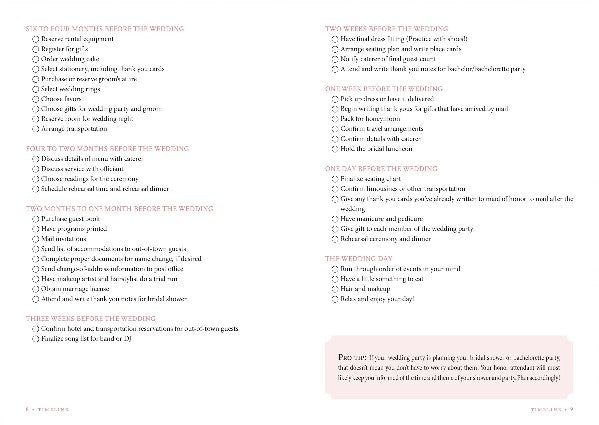 Planning a wedding can be a challenging affair. This purse-sized guided notebook will make life easier for the bride on-the-go! Concise fill-in lists and charts enable you to compile the essential information you need to stay on track as you plan pre-wedding gatherings, the big day itself, and beyond.