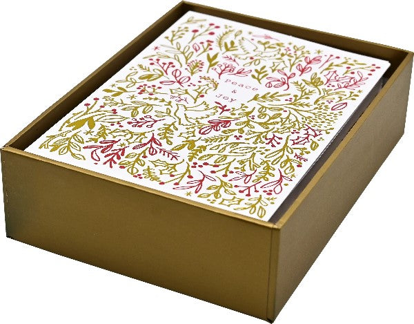 Sprigs of holly, mistletoe, and evergreen surround a dove in flight and the words ''Peace & Joy'' on this vibrant greeting card.