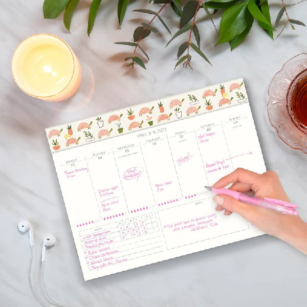 Maximize your productivity one week at a time with the Weekly Desk Calendar. Each tear-off sheet includes ample room for daily appointments and reminders as well as space to track goals and hydration, a check-off to-do list, and current- and next-month references. The screw-post-bound hardcover features a delightful illustration to keep you smiling all year long.