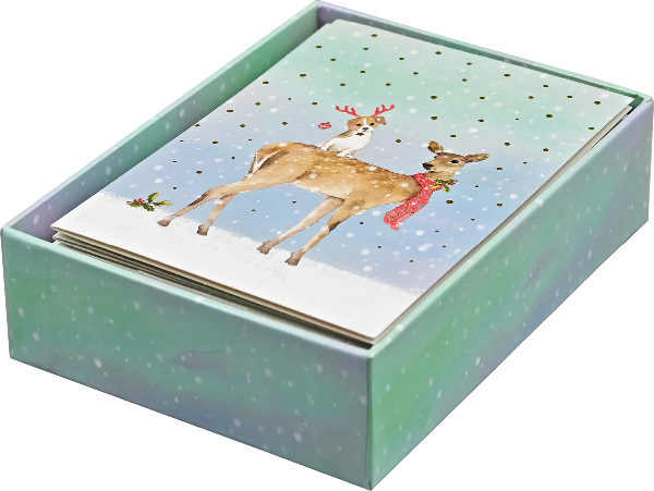 This premium holiday card set features a deer and its canine companion both sporting holiday apparel.
