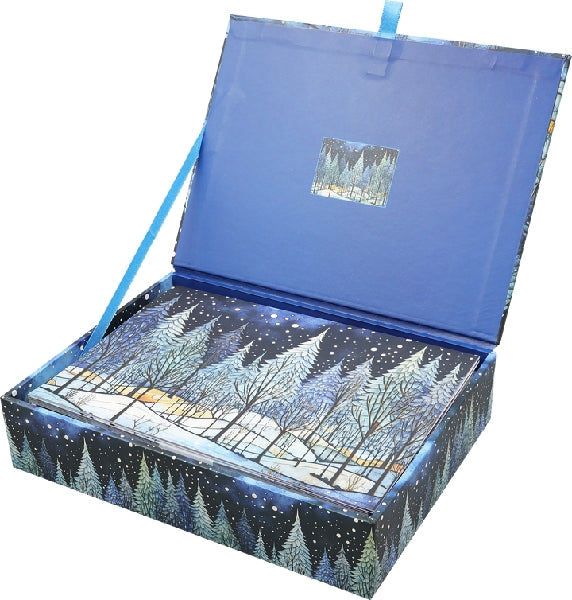 Celebrity the serenity of the season with these beautiful notecards featuring snow falling on a tranquil forest at nightfall. The serene blue hues embellished with gold foil create a magical winter wonderland.