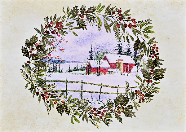 This premium card set features a snow-clad country barn, complete with silo and milkhouse, is framed by a wreath of holly on this beautiful greeting card.
