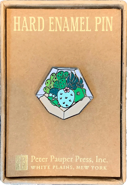 Add style to jackets, hats, and bags with this stunning Succulents Pin, depicting a terrarium filled with plants!