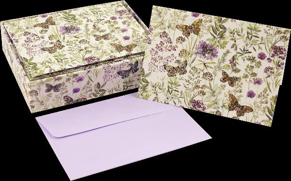This premium boxed stationey notecards set depicts four butterflies taking flight above a meadow of wildflowers and is embossed and embellished with flecks of gold foil.