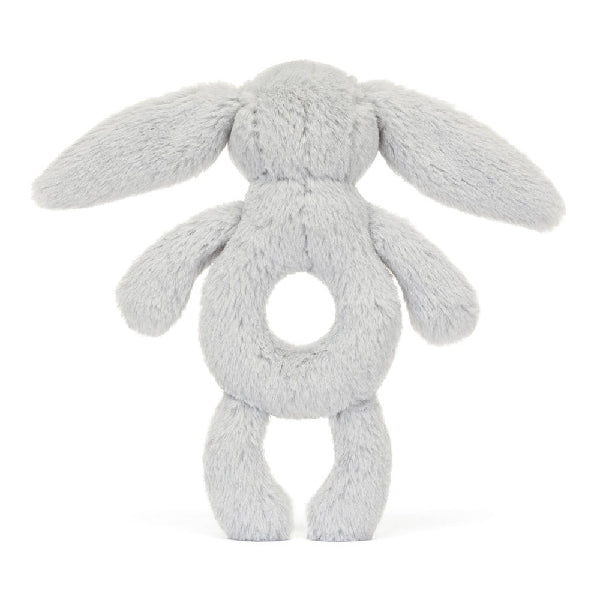 A treat for tiny hands, Bashful Silver Bunny Ring Rattle can be grabbed by its soft paws, long lop ears or ring-shaped tummy. When given a gentle shake it will sound the rattle inside, much to baby’s delight! Crafted in a silver-grey coloured fur made from recycled fibres featuring a Bashful Bunny pink suedette nose and embroidery eyes.
