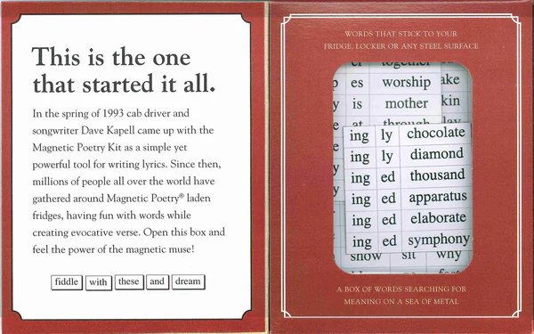 This is the kit that, since it came out in 1993, has launched a gajillion fridge door poems! It includes over 300 carefully-chosen words and word fragments designed to take your imagination to all kinds of uncharted territories. Includes a gorgeous symphony of words including (of course) gorgeous, symphony, elaborate, time, soar, dream and many, many more!