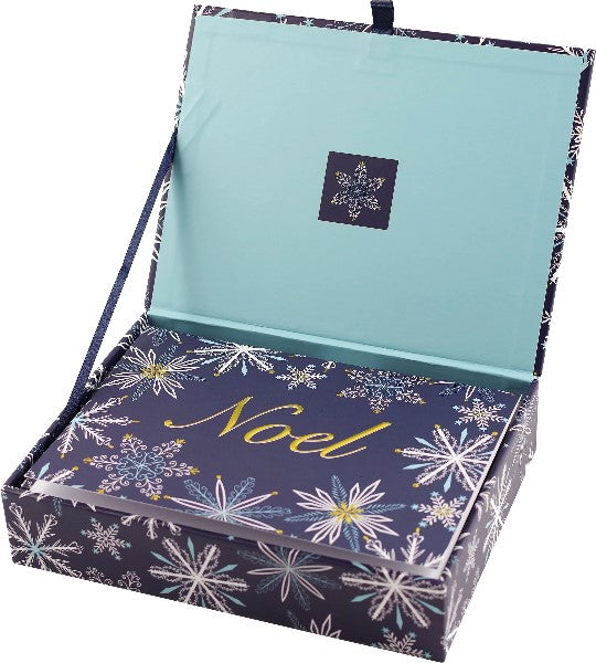 The word ''Noel'' is stamped in gold foil and surrounded by delicate snowflakes on this elegant greeting card.