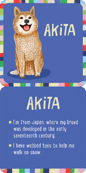 Brighten your child's day with paws-itively adorable dog illustrations and fetching canine facts! Each card introduces kids to a different dog breed, from the petite Pekingese to the giant Saint Bernard. They'll discover which dog has been all the way to Antarctica, what skill makes the golden retriever an ideal chef, how some dogs offer a helping paw to humans everywhere, and more.