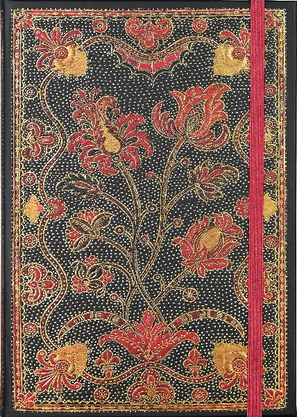 Add a touch of timeless elegance to your writing with this ornate black notebook, adorned with intricate gold and red floral detailing inspired by classic French mosaics, and finished with a rich red elastic closure for style and security.