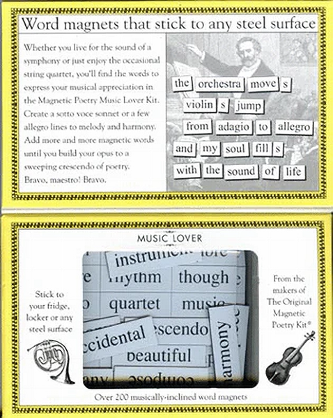 Whether you live for the sound of a symphony or just enjoy the occasional string quartet, you'll find the words to express your musical appreciation in the Music Lover Kit. Create a sotto voce sonnet or a few allegro lines to melody and harmony. Add more and more magnetic words until you build your opus to a sweeping crescendo of stirring poetry. Bravo, maestro! Bravo!