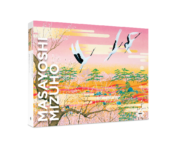 Red-crowned cranes in a sunrise tableau replete with plum blossoms, pine trees, and bamboo—in Ume Gasumi, Masayoshi Mizuho paints shō-chiku-bai, a lucky combination that celebrates longevity, beauty, strength, and resilience.